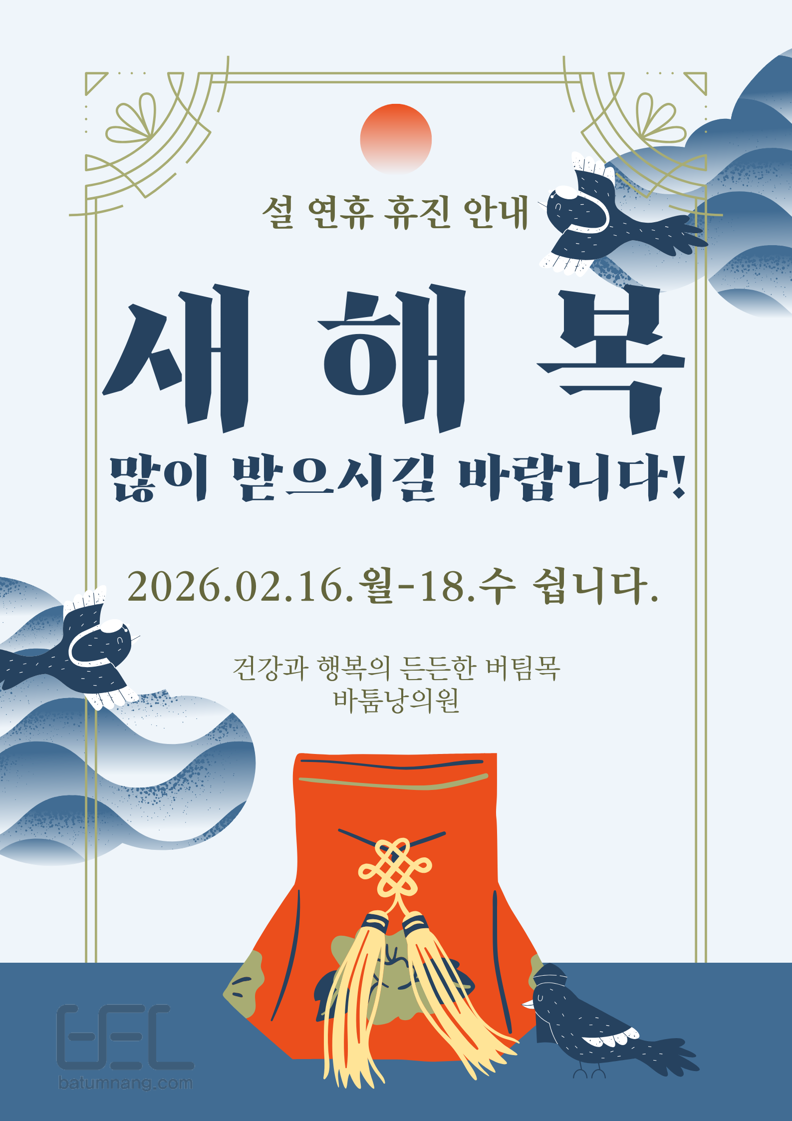 2026 설 연휴 휴진 안내 Posted by 바툼낭 | 2026-02-09 | 공지 | 0 | 설 연휴 휴진 안내 새 해 복 많이 받으시길 바랍니다! 2026.02.16.월-18.수 쉽니다. 건강과 행복의 든든한 버팀목 바툼낭의원